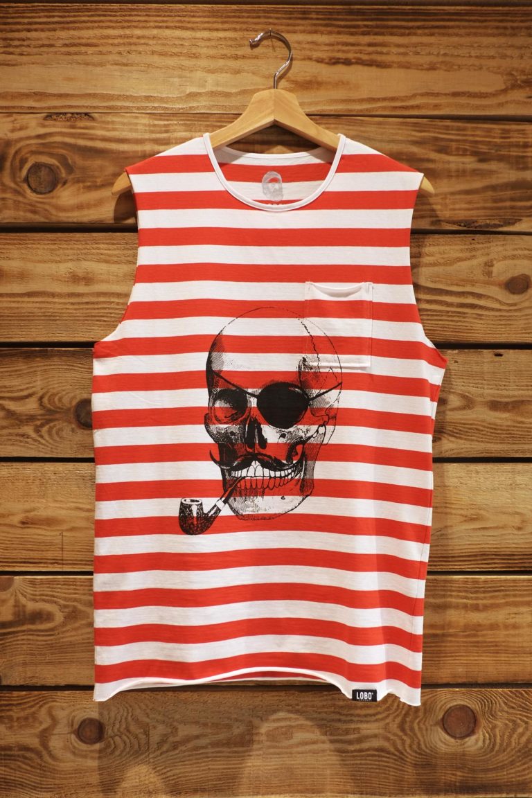 • Camiseta sem mangas às riscas vermelhas e brancas com estampado de crânio com tapa-olho e cachimbo, pendurada em cabide de madeira