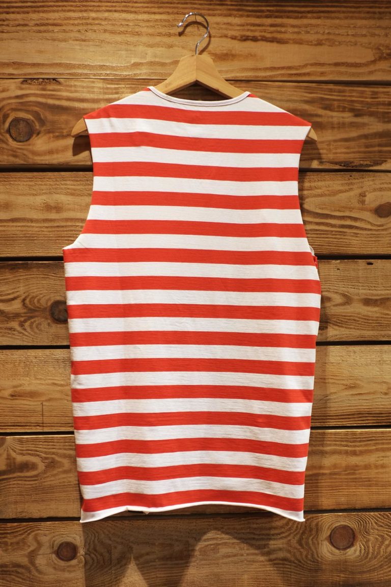 Red and white stripes tank t-shirt with skull silk screen printing. Raw edge.