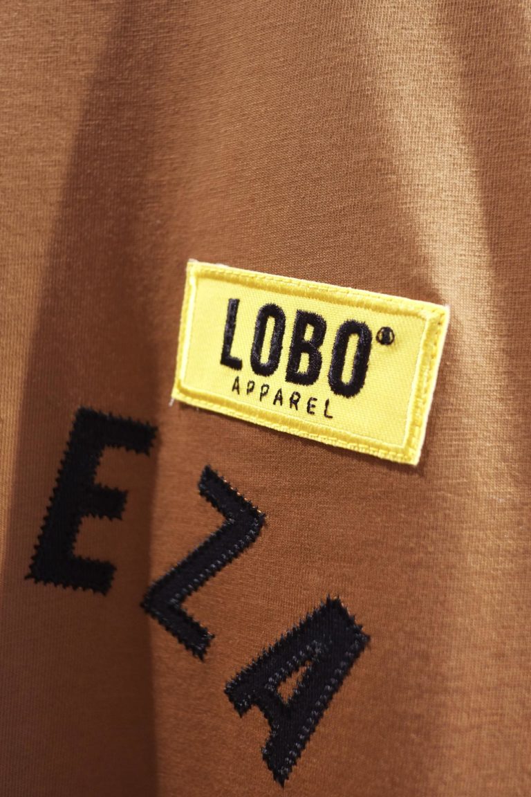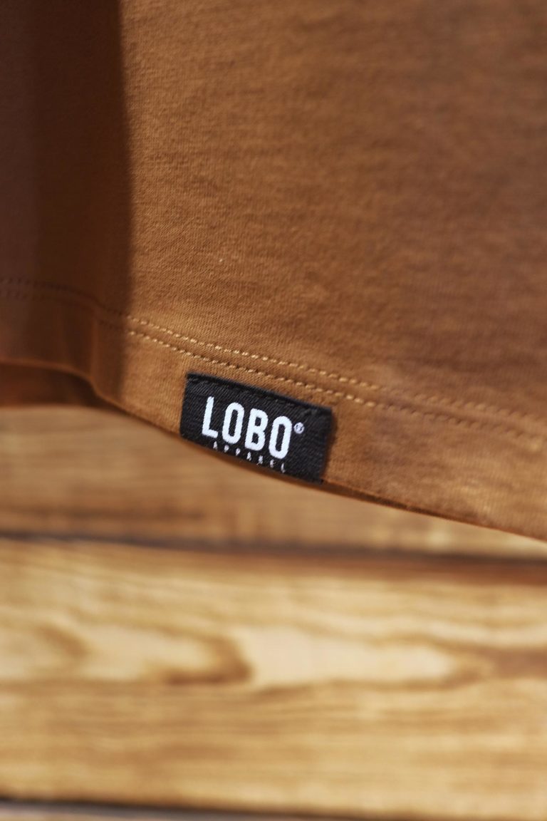 • Etiqueta LOBO numa peça de vestuário castanha com fundo de madeira