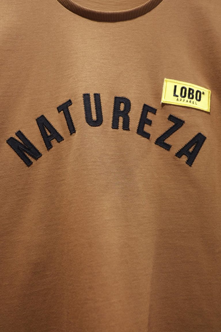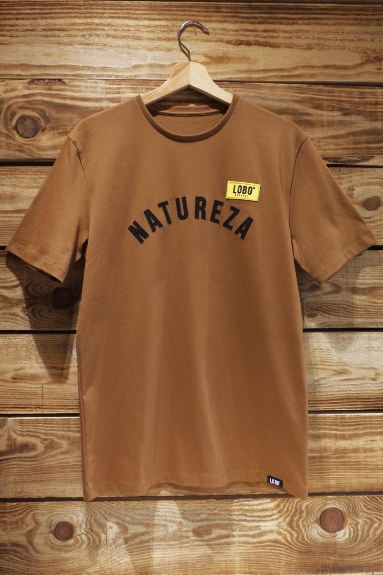 Brown t-shirt with black embroidered letters “NATUREZA” and Yellow “Lobo” patch. Unisex