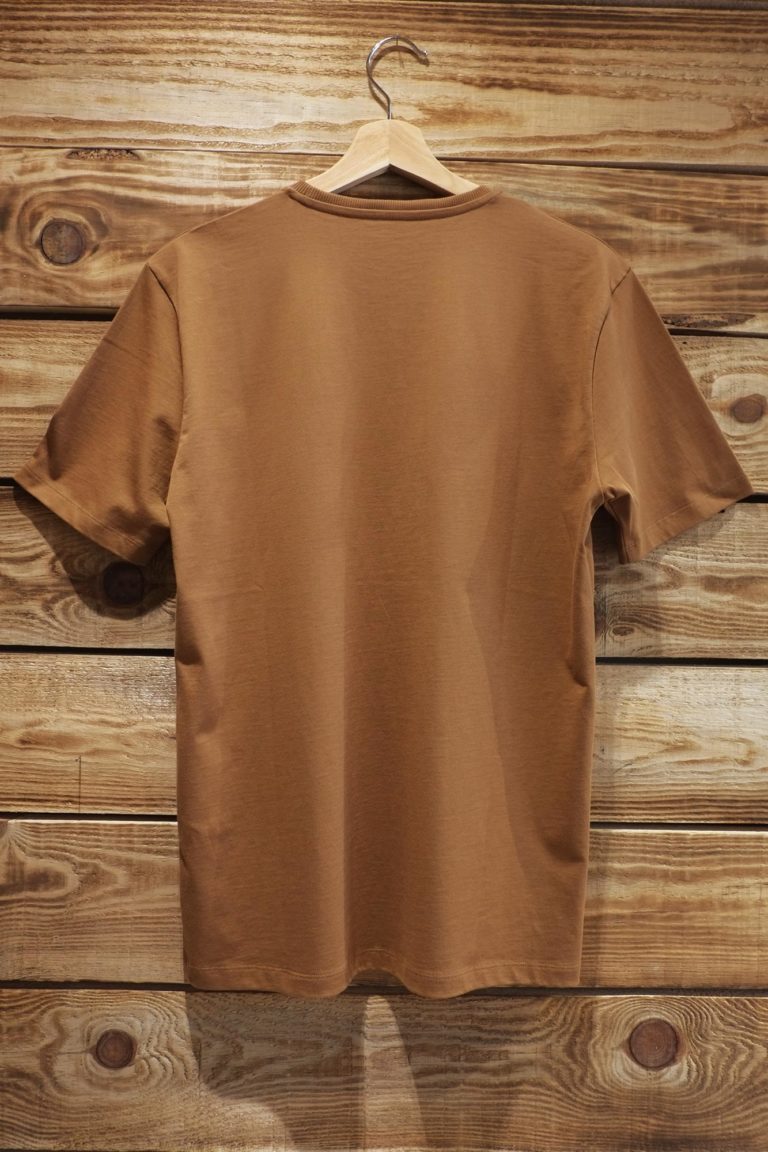 • T-shirt castanha de manga curta pendurada em cabide de madeira com fundo de parede de madeira