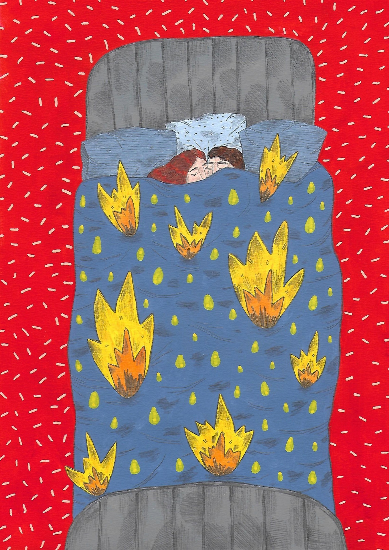 • Ilustração casal a dormir em cama cinzenta com edredão azul e chamas amarelas