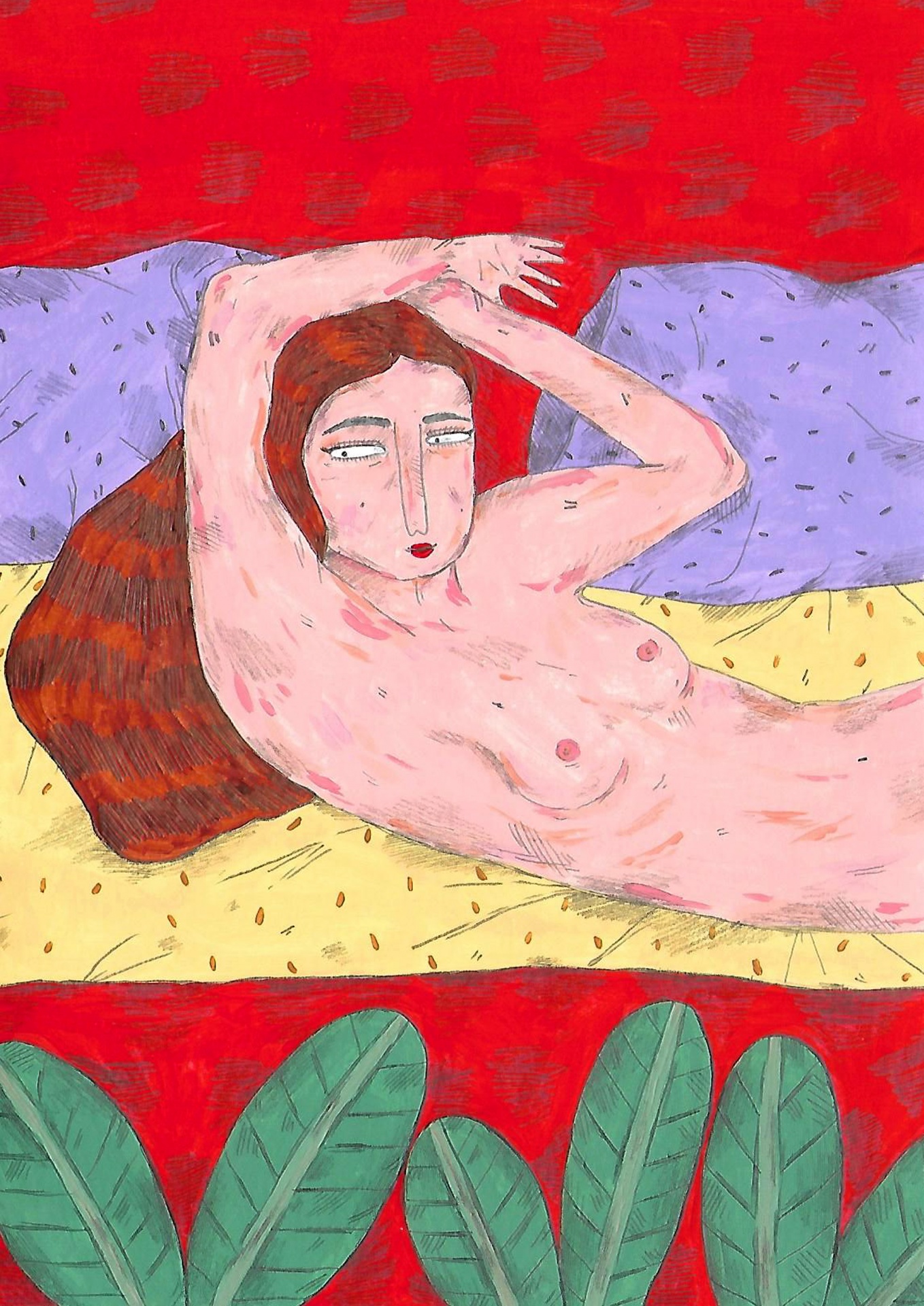 Ilustração digital de mulher nua de cabelos compridos deitada sobre almofadas coloridas com folhas verdes