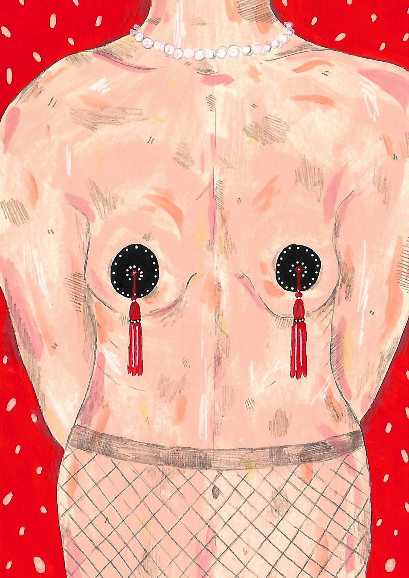 Ilustração de torso feminino com acessórios e meia arrastão