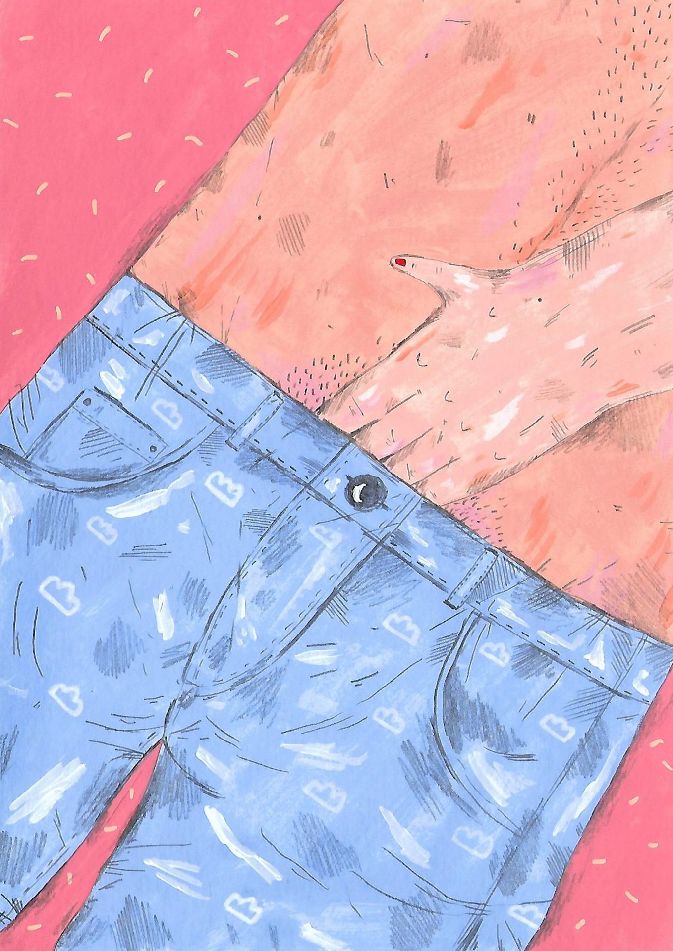 • Calças de ganga azuis claras com padrão e mão de pessoa com torso e fundo rosa