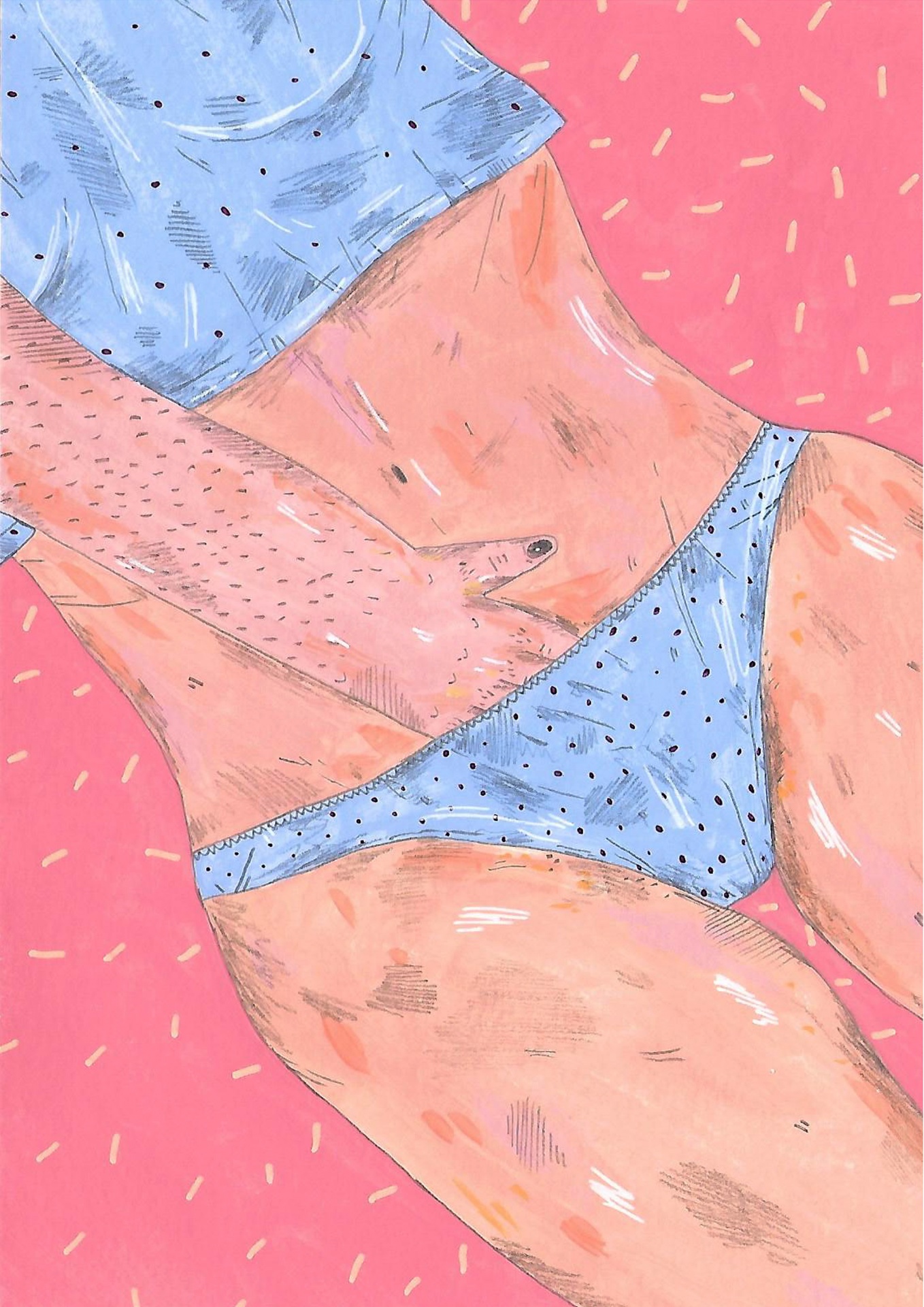 • Ilustração de pessoa com roupa interior azul com padrão preto em fundo rosa