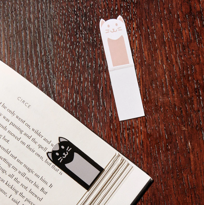 • Marcadores de página em forma de gatos branco e preto sobre um livro e mesa de madeira.