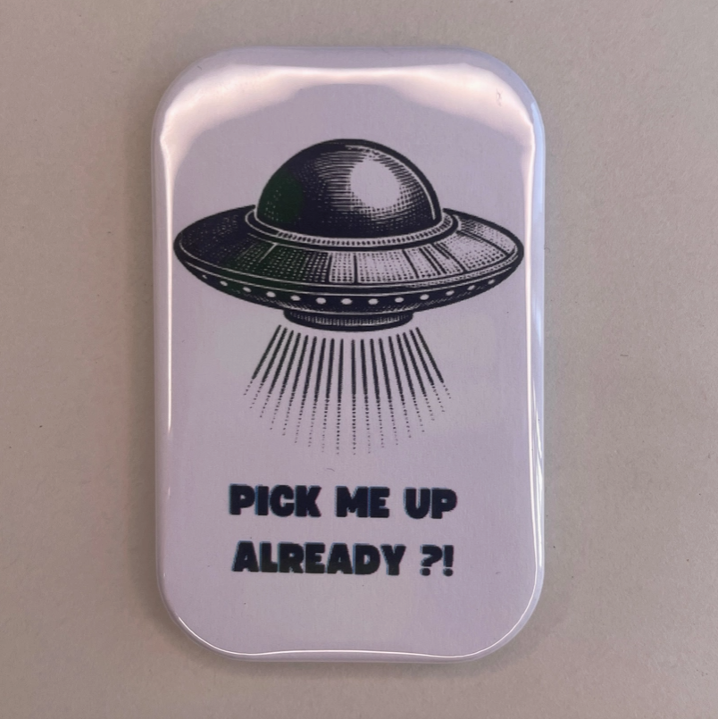 Já me vens buscar?!“ Um íman bem-humorado para todos os que, por vezes, se sentem como se tivessem aterrado no planeta errado. O motivo UFO em estilo retro clássico combina estética sci‑fi com humor seco do quotidiano e capta imediatamente a atenção. A ilustração nítida a preto e branco lembra antigas gravuras de ficção científica e destaca‑se fortemente dos motivos coloridos habituais. Isso faz com que o íman seja simultaneamente engraçado, nostálgico e visualmente marcante.