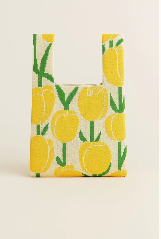 Uma mala de malha escultural inspirada em tulipas em flor e arte têxtil moderna. Com o seu ousado motivo floral em amarelo e marfim suave, esta peça parece tanto lúdica quanto refinada — como carregar um pequeno jardim de primavera consigo. A icónica alça com nó cria uma silhueta única, mantendo-se leve e prática para os essenciais do dia a dia.