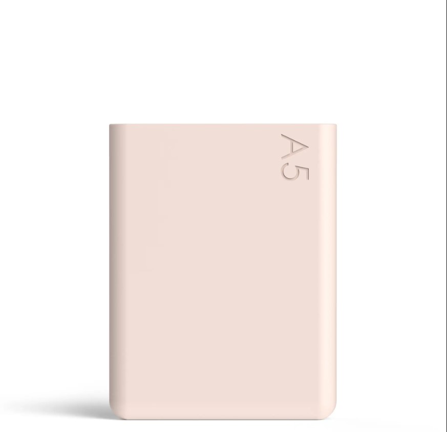 • Caderno rosa claro A5 com capa dura e cantos arredondados