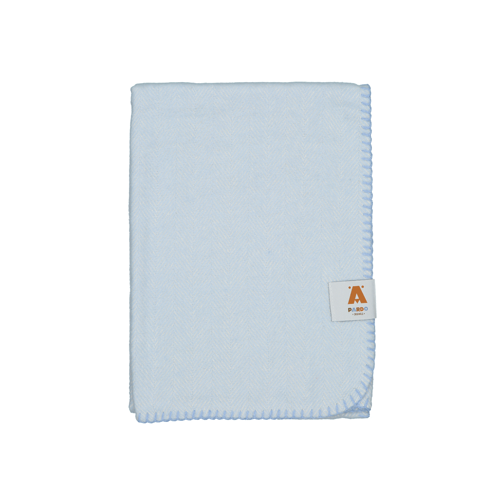• Cobertor azul claro com etiqueta e borda reforçada.