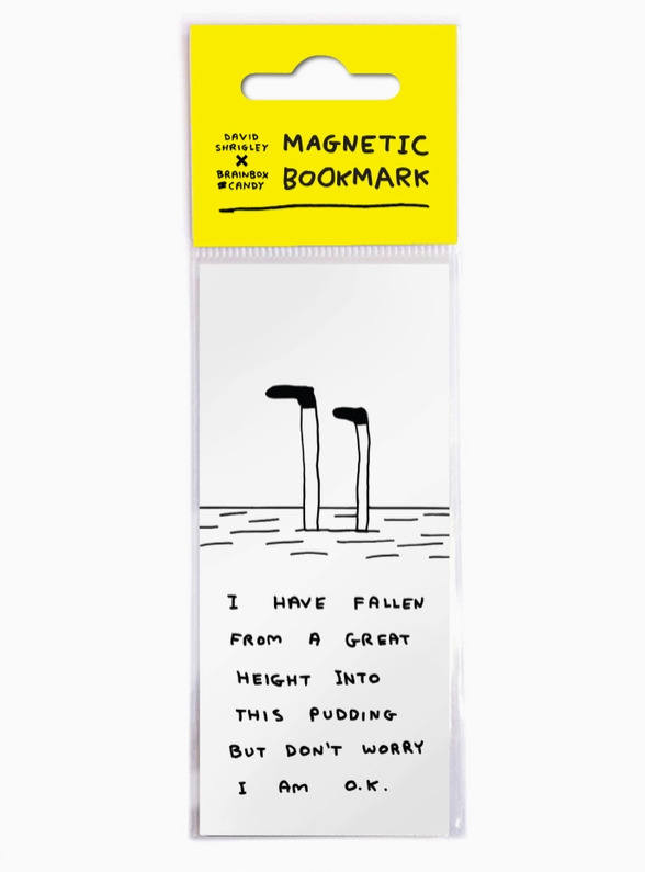 Adornado com as ilustrações peculiares e o humor espirituoso de David Shrigley, este engraçado marcador magnético é perfeito para pessoas que gostam de ler livros mas não gostam de vincar as páginas! Estes pequenos marcadores magnéticos inteligentes dobram perfeitamente sobre uma ou várias páginas e fixam-se magneticamente - portanto, ao contrário de um marcador tradicional, não vão cair! Não se contente com marcadores antigos e chatos quando pode adicionar um toque do brilho de Shrigley às suas ofertas!