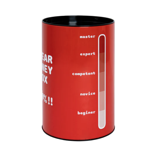 • Caixa de moedas vermelha cilíndrica com texto branco