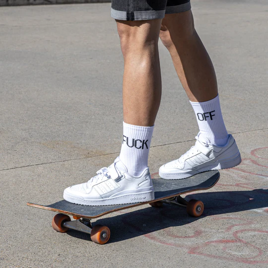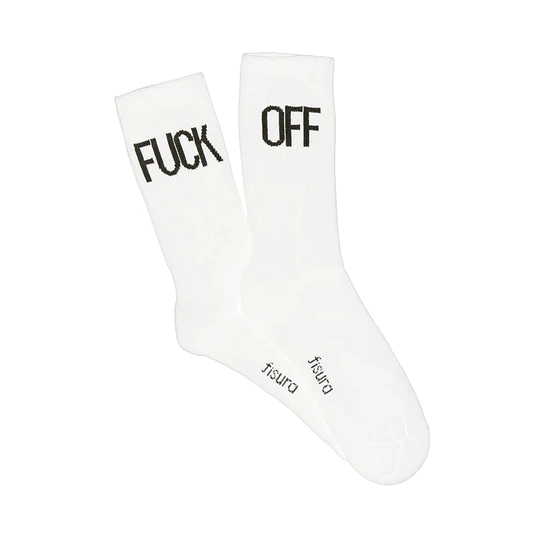 Meias brancas com texto preto 'FUCK OFF' e marca 'fsuru' na parte inferior