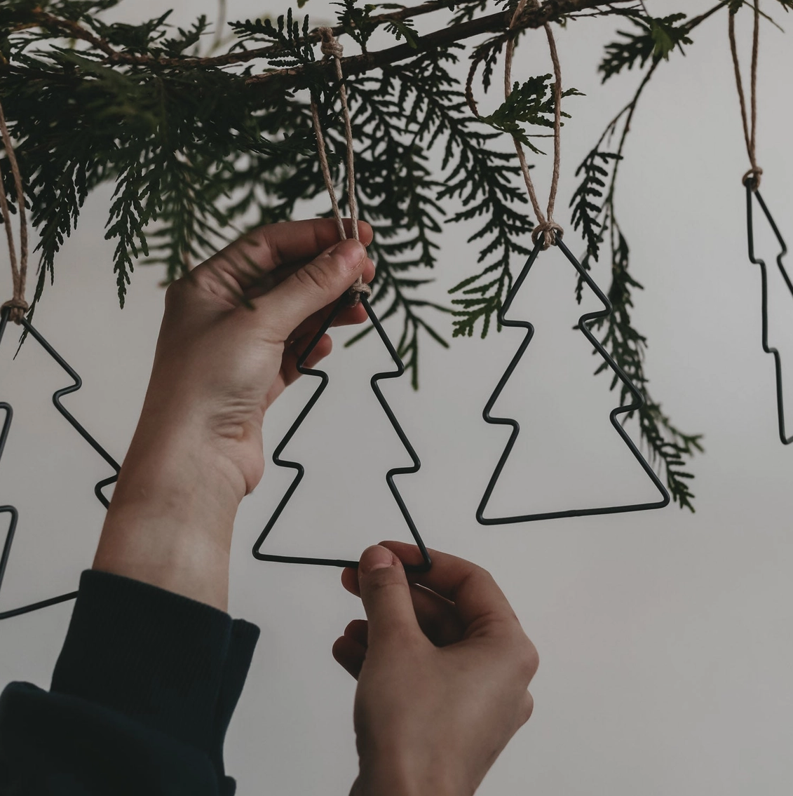 Mãos penduram ornamentos em forma de árvore de Natal de metal preto com cordão numa árvore verde