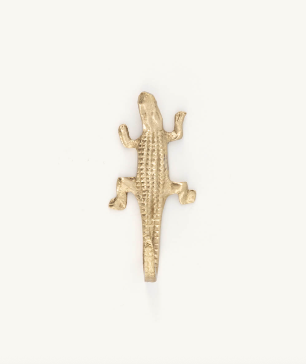 • Acessório dourado em forma de crocodilo sobre fundo branco.