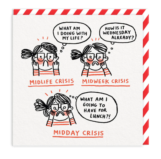 It's illustrated with a woman having a mid-life, mid-week and midday crisis- perfect for anyone enduring a busy week.