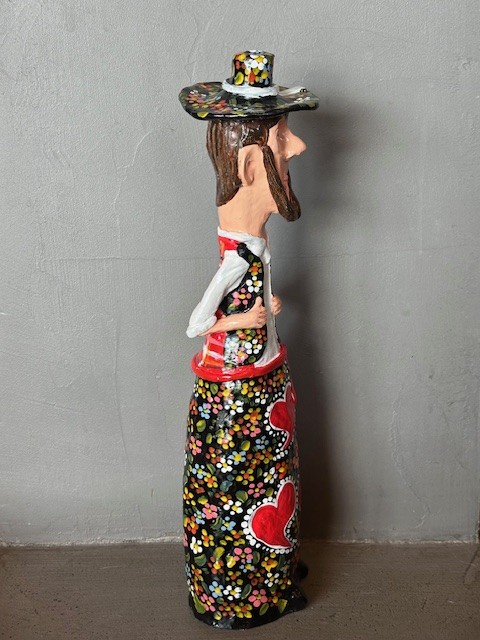• Estátua de cerâmica de homem com chapéu e saia decorados com padrões florais e corações vermelhos