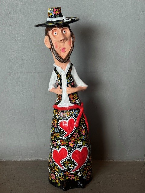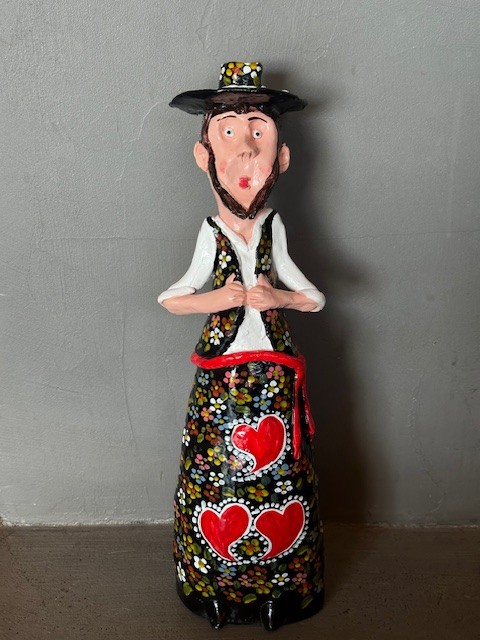 Estátua de cerâmica de homem com chapéu e saia decorados com padrões florais e corações vermelhos