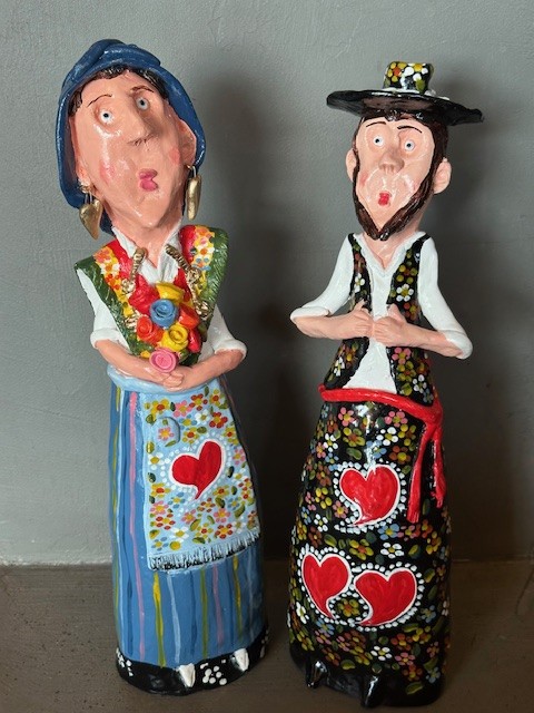 • Estatuetas coloridas de casal com roupas tradicionais e corações, em fundo cinzento.