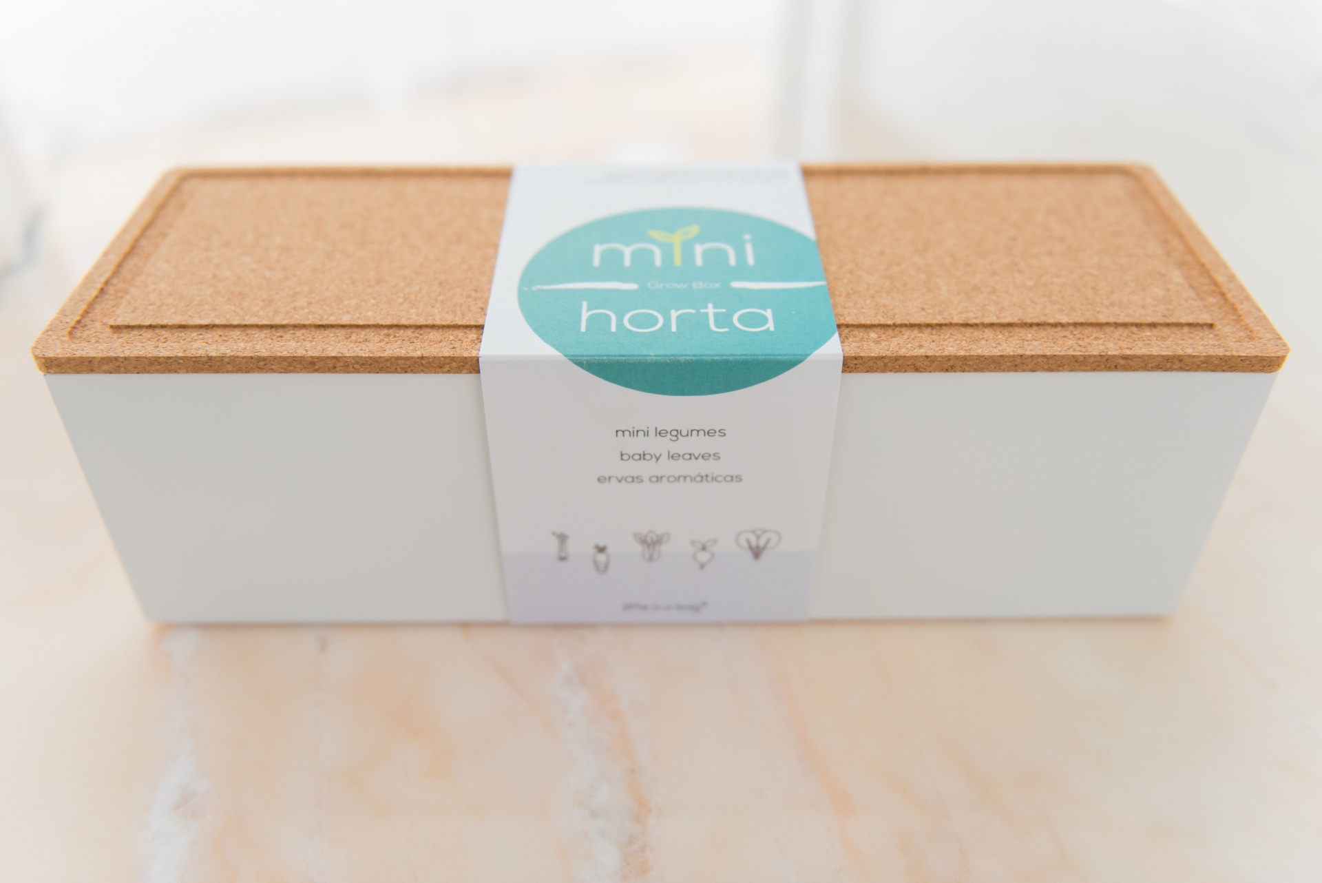 • Caixa branca com tampa de cortiça e etiqueta 'mini horta'