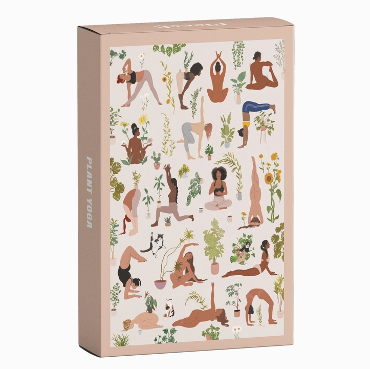 • Quebra-cabeça com pessoas a fazer yoga e plantas, numa caixa com o texto PLANT YOGA
