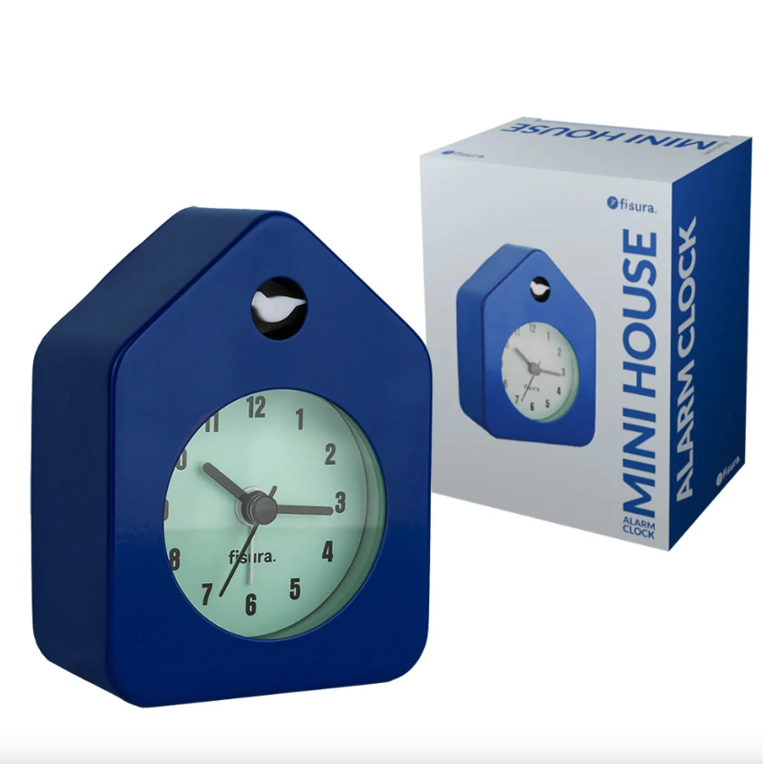 • Relógio de mesa azul em forma de casa com alarme e caixa