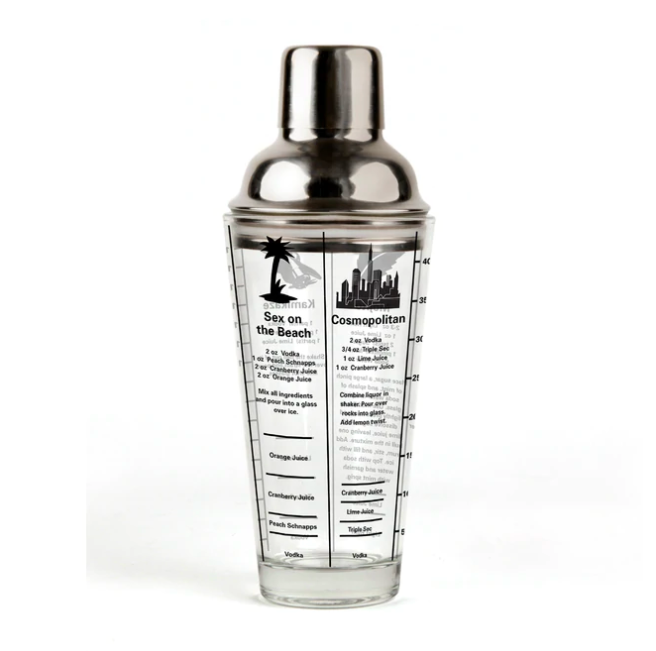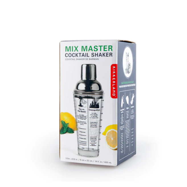 ancy yourself a bartender? The Mix Master Cocktail Shaker has recipes and pour markings for six classic cocktails, making it easy to prepare perfect drinks. Includes recipes for: White Russian, Sex on the Beach, Cosmopolitan, Long Island Iced Tea, Mojito and Kamikaze.