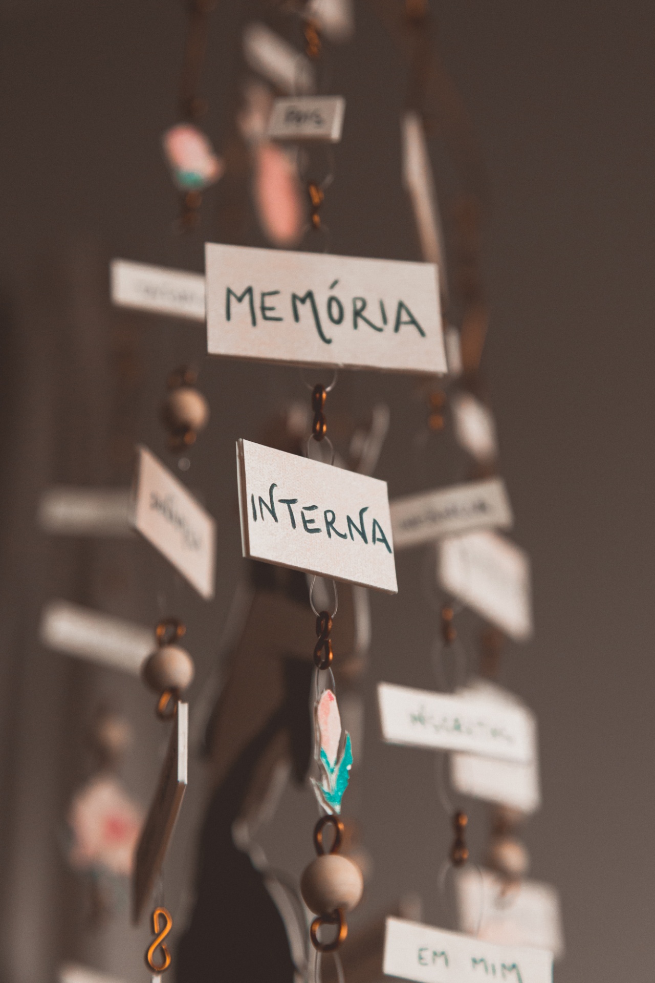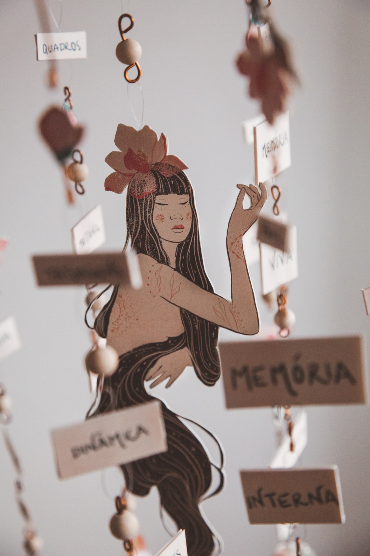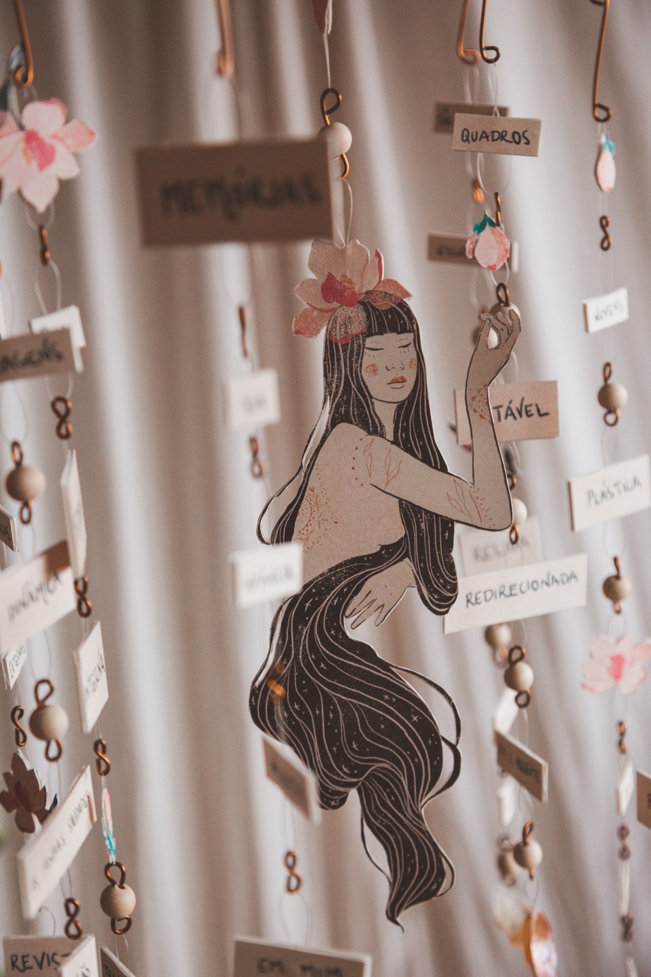 18. A saudade é viva, Móbile - Fio de alumínio, papel, madeira - Peça única