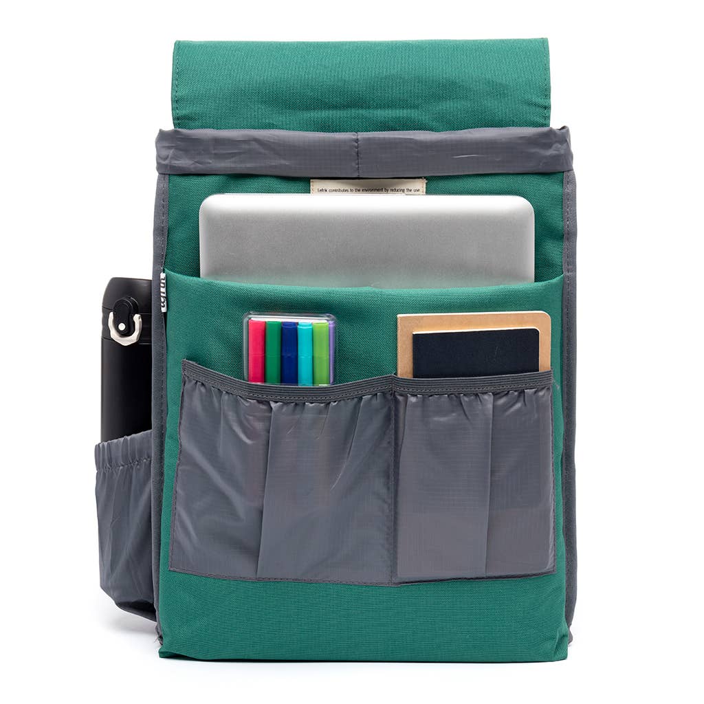 • Mochila verde e cinza com bolsos frontais contendo itens diversos