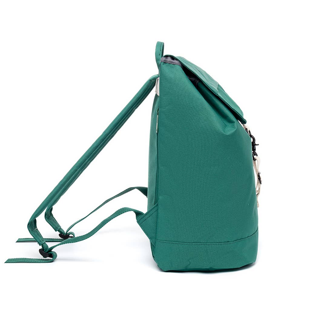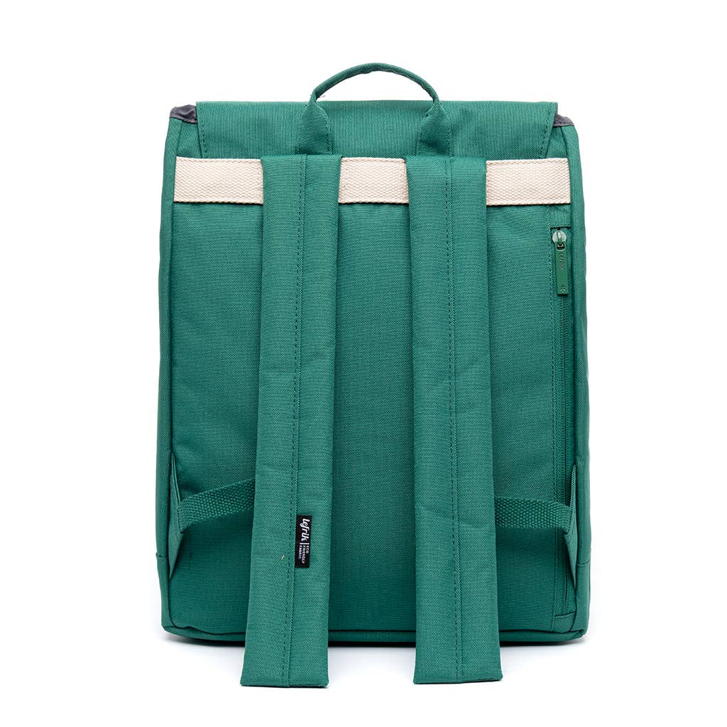 • Mochila verde de tecido com fecho de aba e tira branca