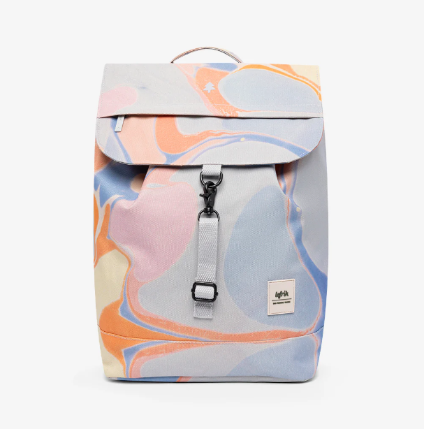 • mochila tecido padrão marmoreado pastel com fecho preto e etiqueta branca