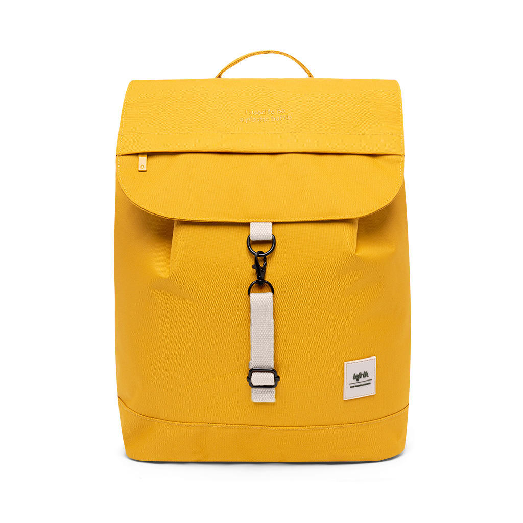 • Mochila amarela com fecho de aba e alça superior