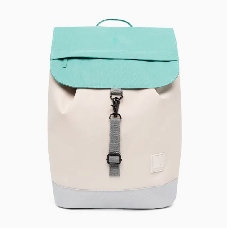 • mochila azul turquesa, branca e cinza com fecho de fivela
