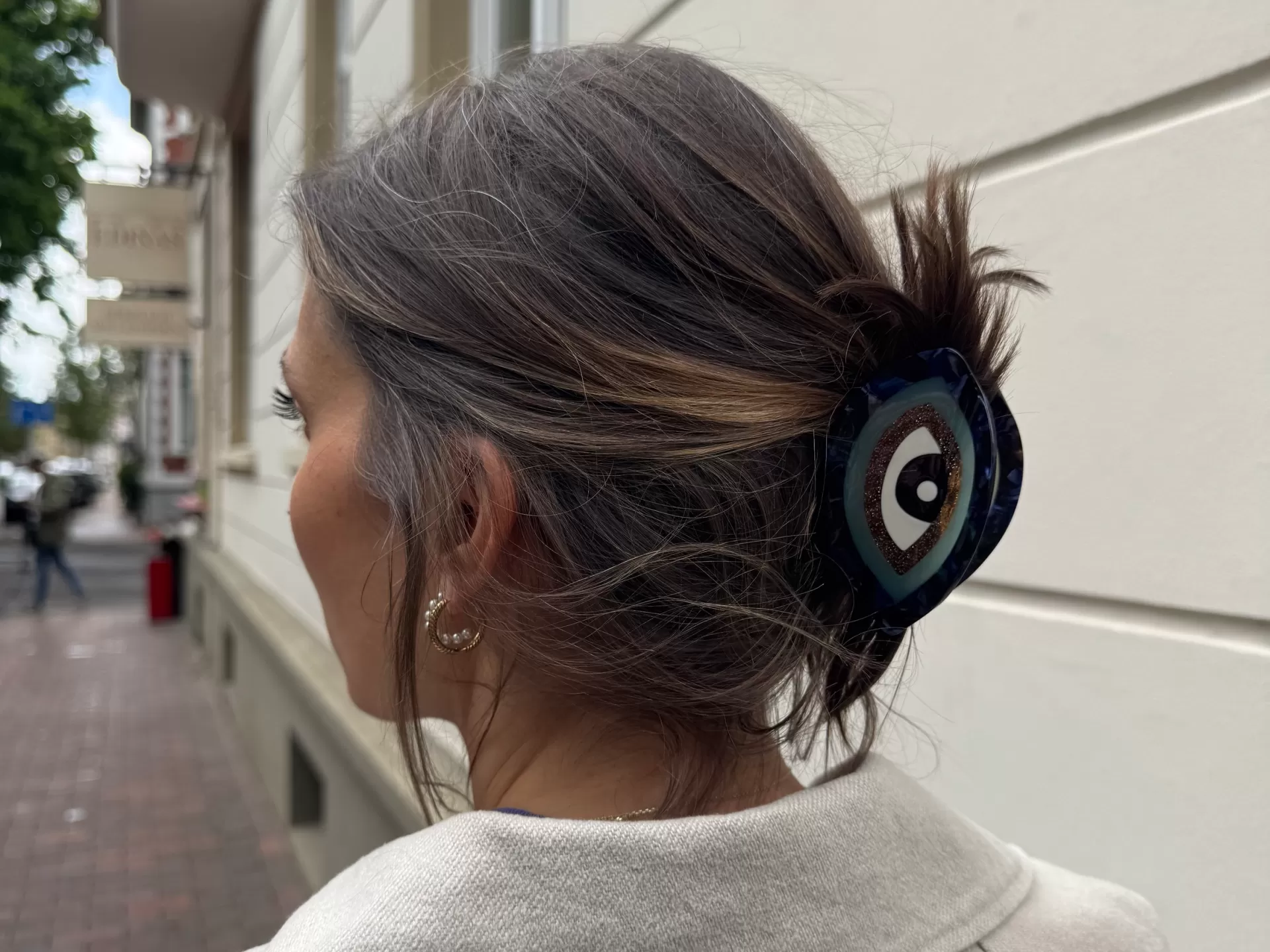 • Mulher com grampo de cabelo azul com padrão de olho grego numa rua urbana