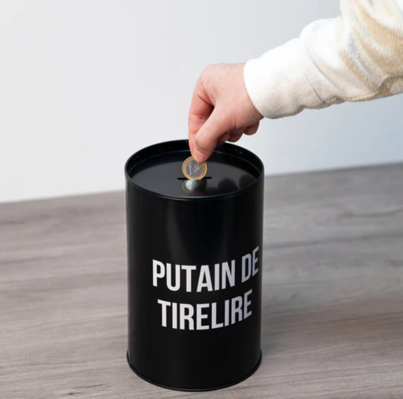 • Pote metálico preto com texto branco e mão a inserir moeda