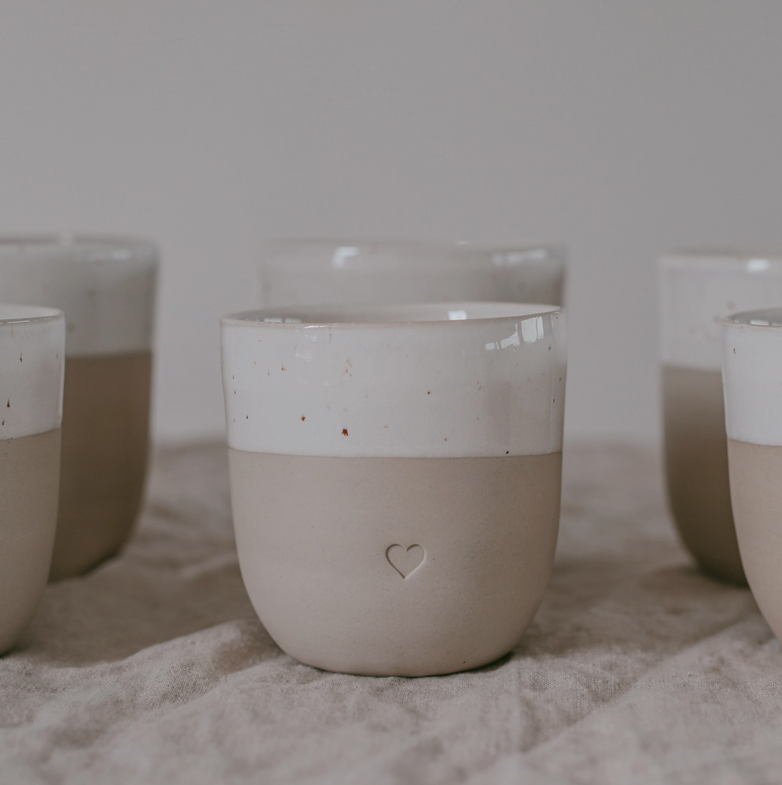 Jarras cerâmicas bicolores bege e branco com coração gravado