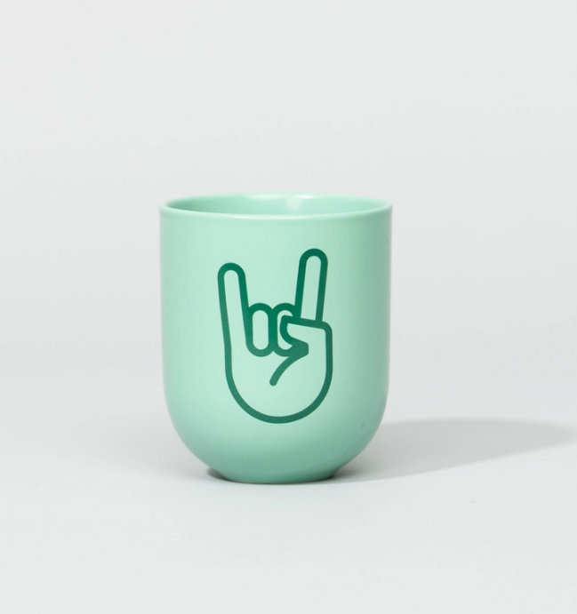 Copo verde claro com desenho de mão a fazer gesto rock