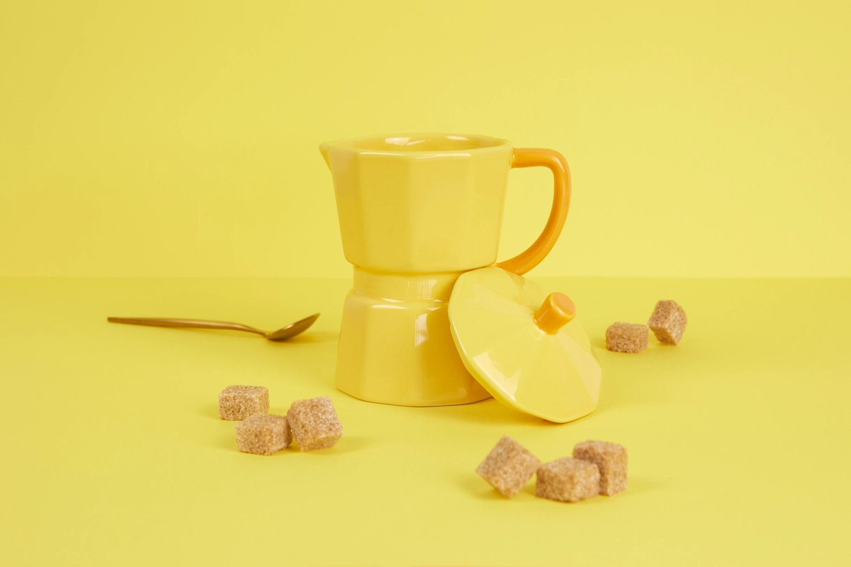 • Cafeteira amarela com tampa e cubos de açúcar castanho num fundo amarelo