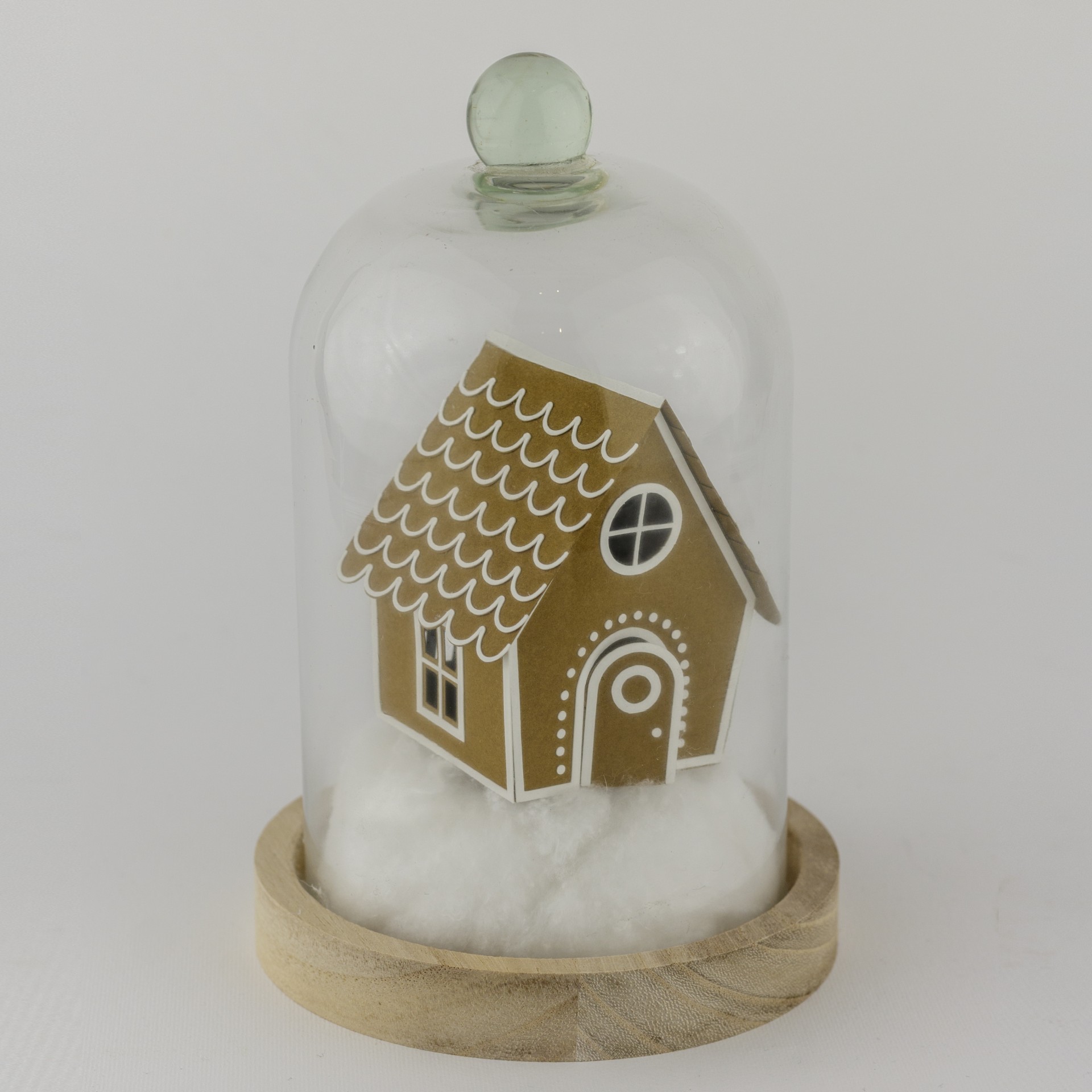 • Casa de gingerbread decorativa numa redoma de vidro com base de madeira
