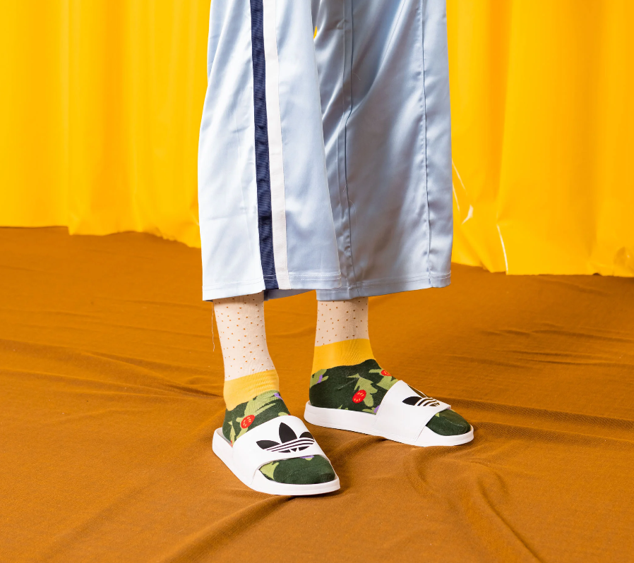 • Chinelos Adidas brancos com padrão verde e preto, meia amarela com pontos pretos, calças azuis claras com listra preta, sobre chão castanho e fundo amarelo.