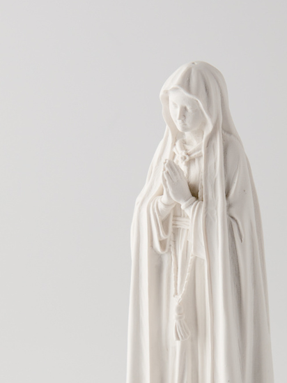 • Estátuas da Virgem Maria coloridas em tons pastel alinhadas em fundo branco