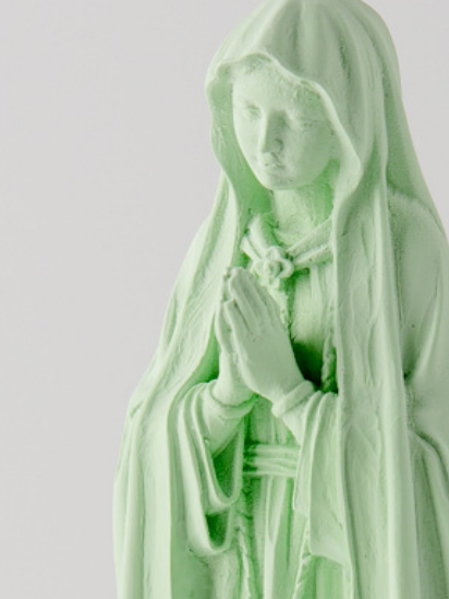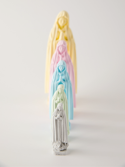 • Estátuas da Virgem Maria coloridas em tons pastel alinhadas em fundo branco