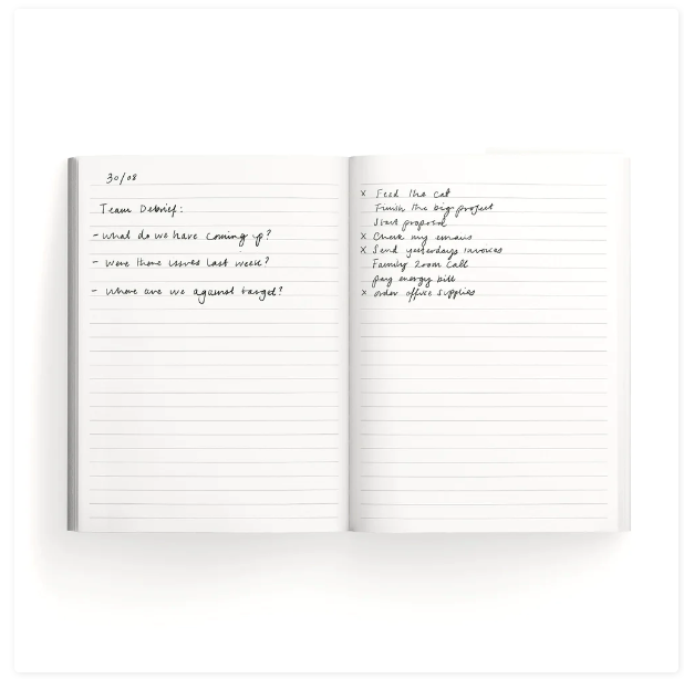 • Caderno aberto com anotações manuscritas em tinta preta.