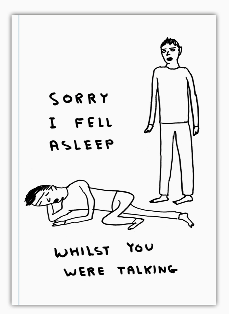 • Ilustração a preto e branco com texto 'SORRY I FELL ASLEEP WHILST YOU WERE TALKING'
