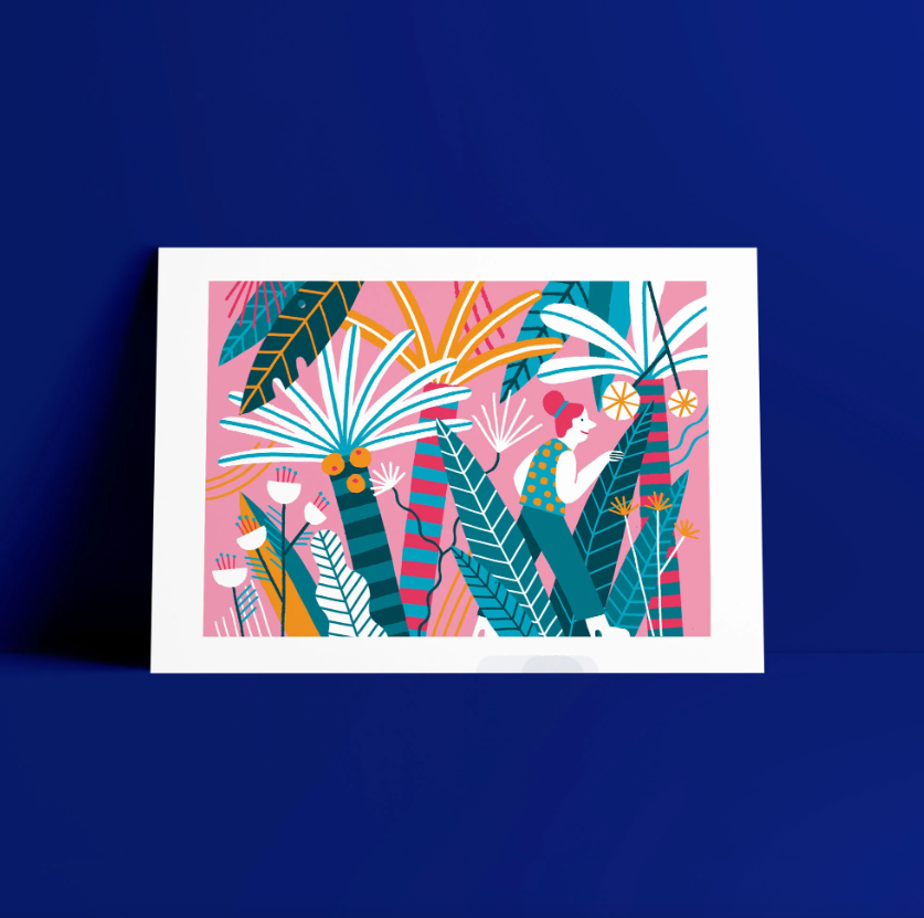 Ilustração colorida com folhas grandes e figuras humanas em moldura branca sobre parede azul