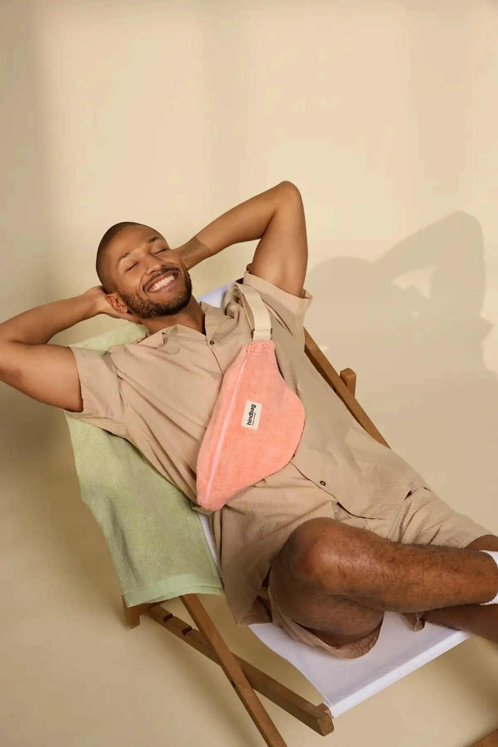 • Homem relaxado com macacão bege e mala tiracolo rosa sentado em cadeira de praia de madeira