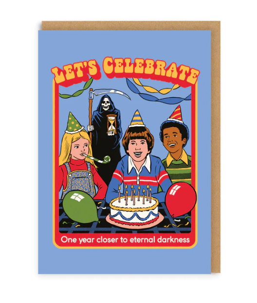 • Cartão de aniversário retro com crianças, bolo, balões, figura da morte e texto humorístico