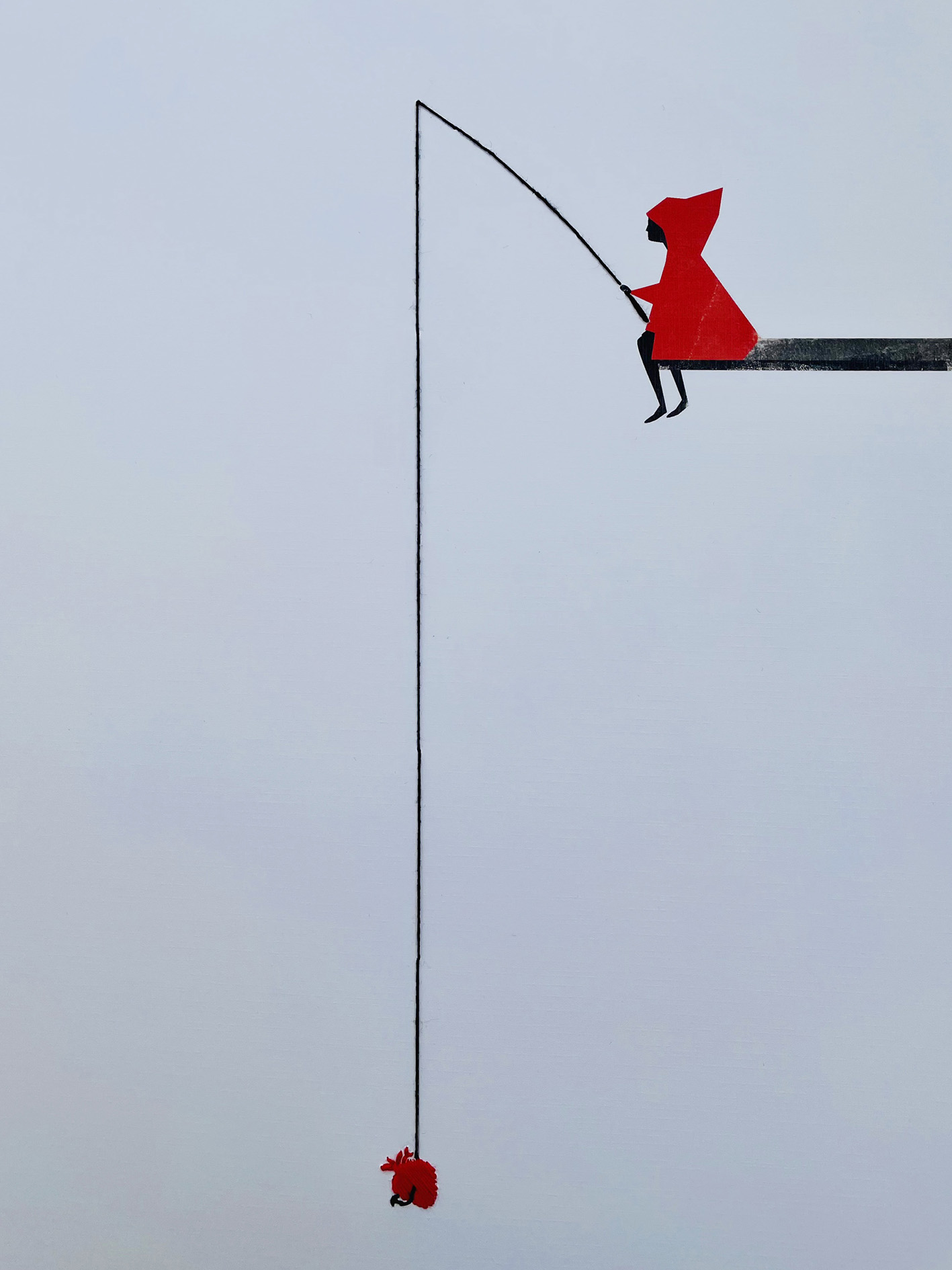 • Ilustração minimalista de pessoa com capuz vermelho a pescar numa linha preta com pequena figura vermelha na ponta.