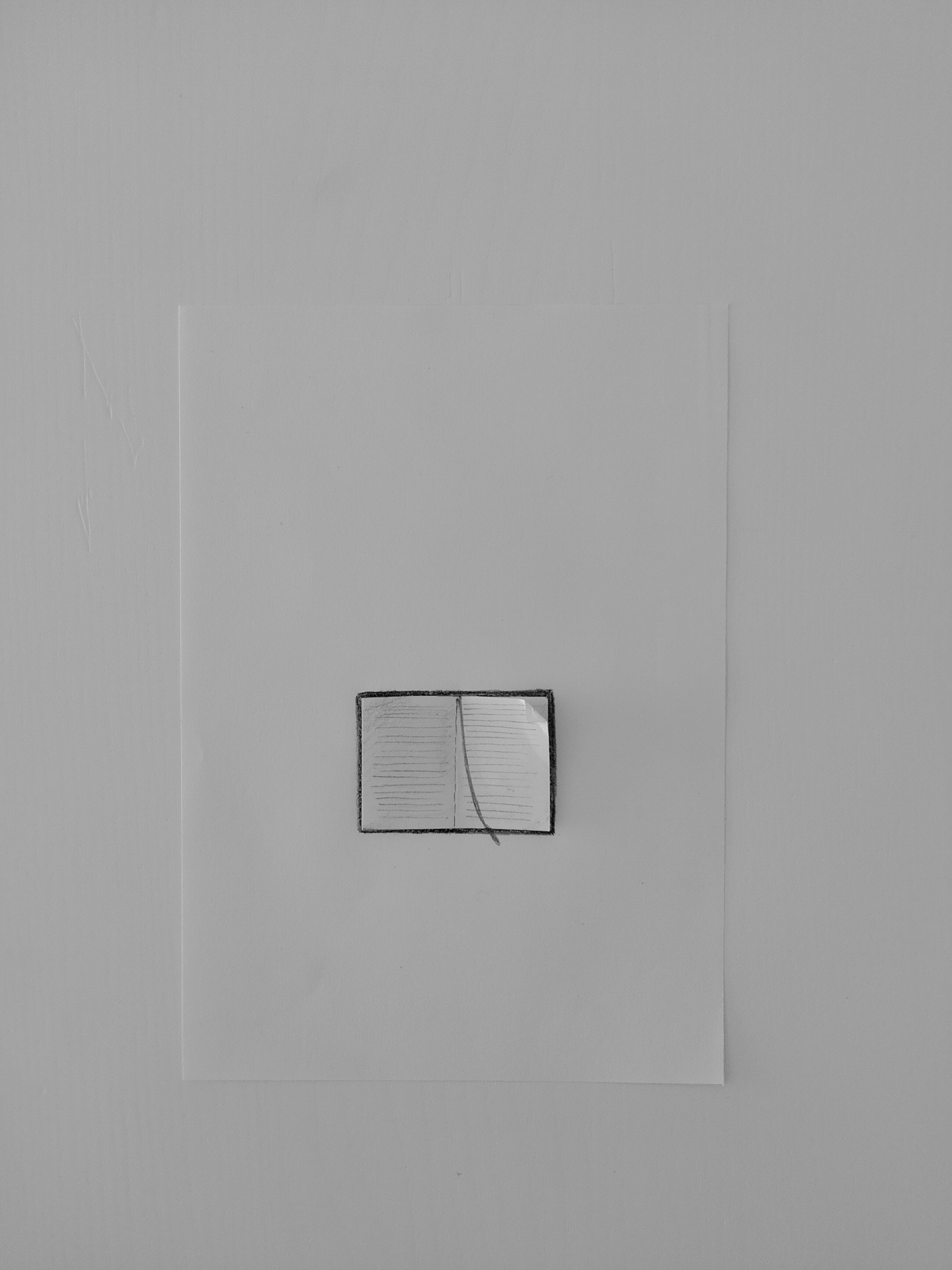 • Caderno pequeno aberto com capa preta e páginas pautadas sobre fundo branco